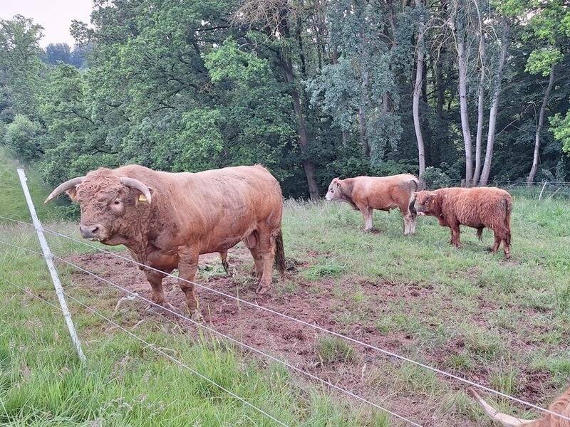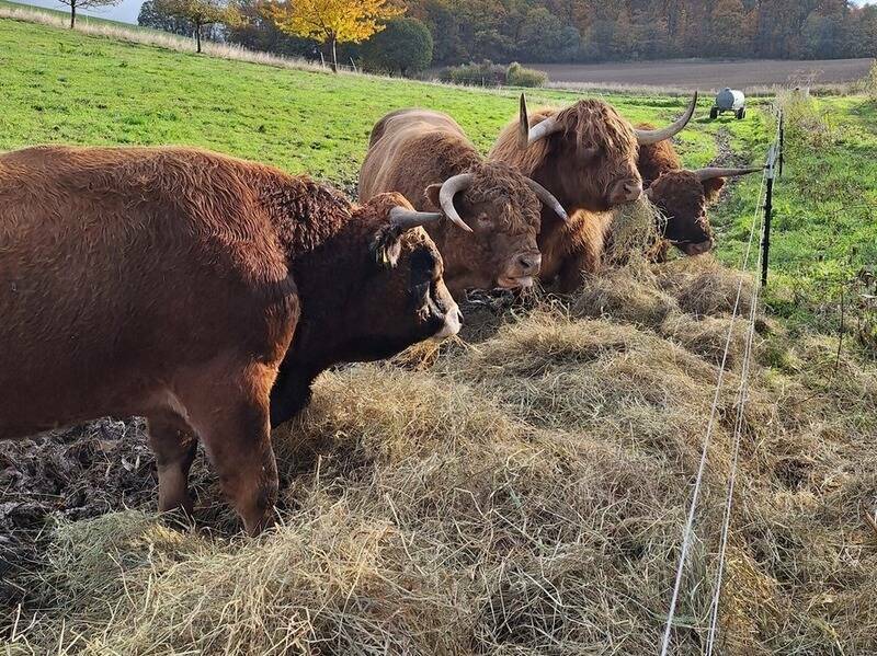 Geschlachtet wird ein 4 Jahre alter Bulle. Der Bulle ist eine Mischung aus den Rassen Aubrac & Highland und wurde vor ca. 4 Jahren bei uns in Mandelbeck auf der Weide geboren. Seit dem verbringt er sein Leben bei uns auf den Weiden, an der frischen Luft mit viel frischem Gras und regionalem Heu (“grasfed“). Wir verzichten bewusst auf Zusatzstoffe im Futter sowie auf Kraftfutter wie z.B. Getreide. Da der Bulle sich von Geburt an bester Gesundheit erfreut hat, musste er auch niemals Antibiotika oder andere Medikamente bekommen. Geschlachtet wird natürlich wieder auf der Weide mit Kugelschuss, um das Tier so stressfrei wie möglich zu schlachten.